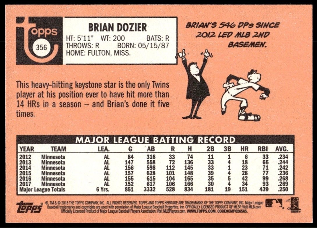 This Baseball card, from 2018 is part of the Topps Heritage card set. Brian Dozier is featured and has a card number of 356.