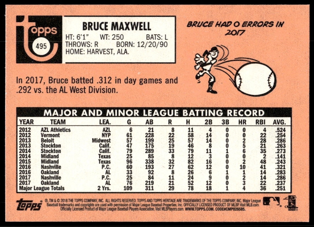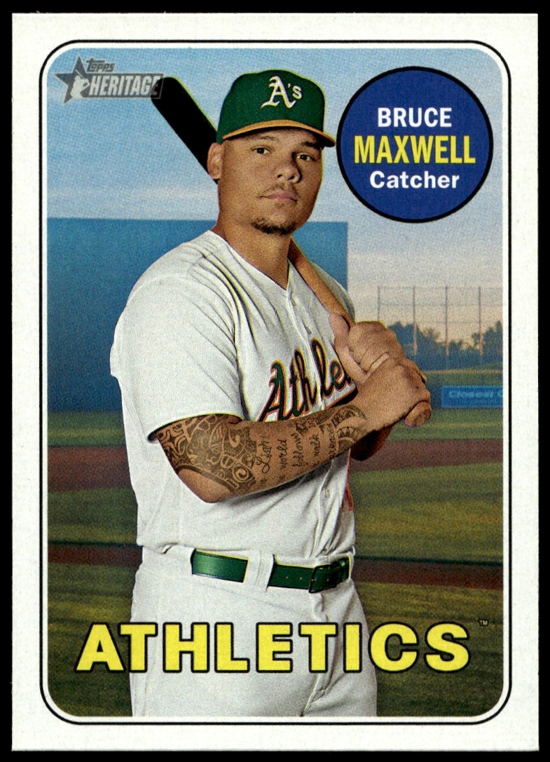 This Baseball card, from 2018 is part of the Topps Heritage card set. Bruce Maxwell is featured and has a card number of 495.