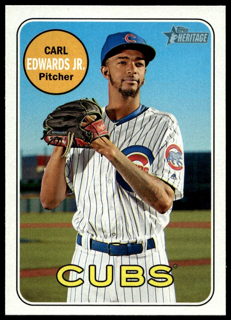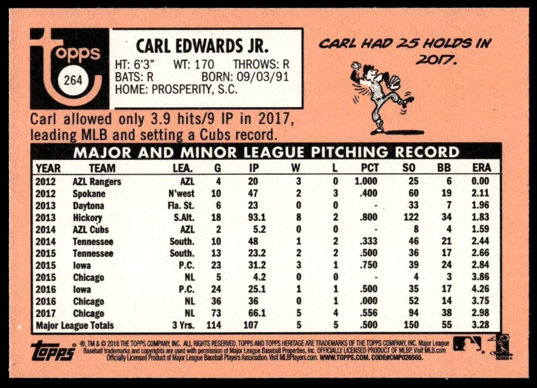 This Baseball card, from 2018 is part of the Topps Heritage card set. Carl Edwards Jr. is featured and has a card number of 264.