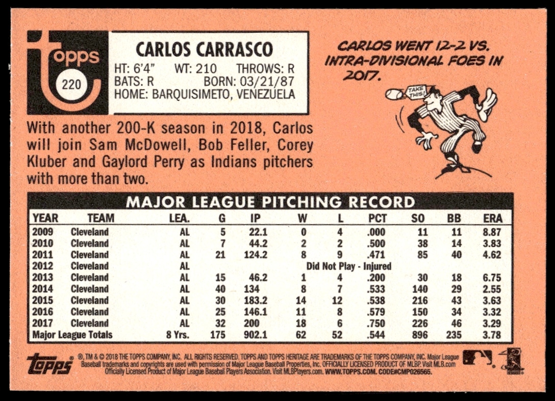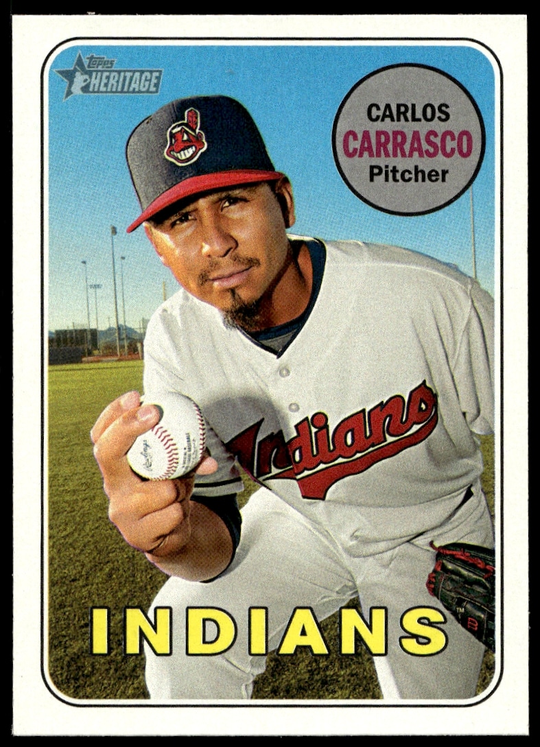 This Baseball card, from 2018 is part of the Topps Heritage card set. Carlos Carrasco is featured and has a card number of 220.