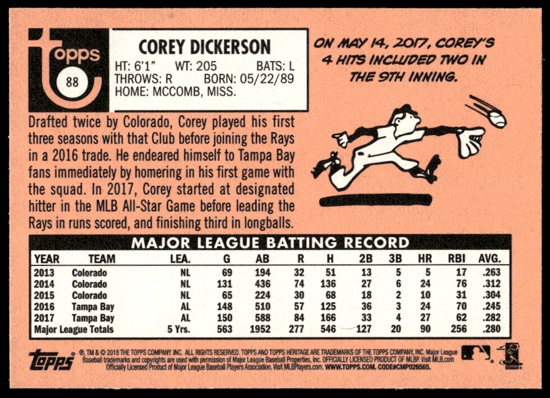 This BaseballΒ card, from 2018 is part of the Topps HeritageΒ card set. Corey Dickerson is featured and has a card number of 88.