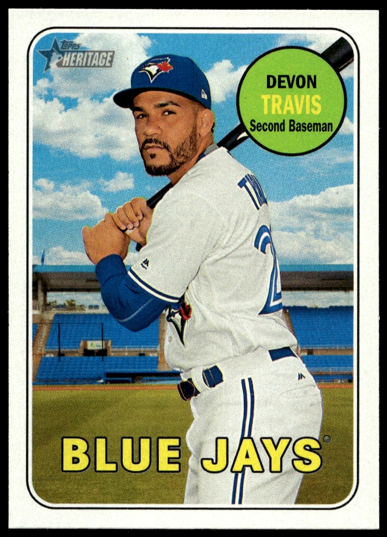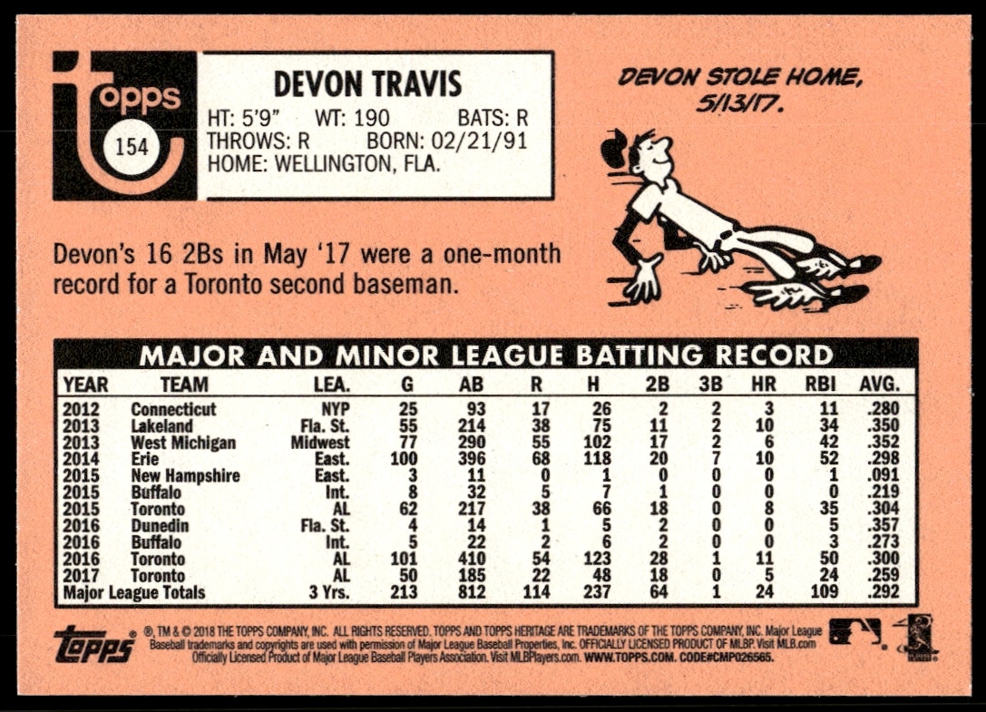 This Baseball card, from 2018 is part of the Topps Heritage card set. Devon Travis is featured and has a card number of 154.
