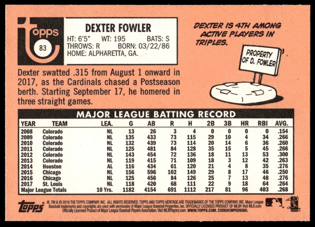 This BaseballΒ card, from 2018 is part of the Topps HeritageΒ card set. Dexter Fowler is featured and has a card number of 83.