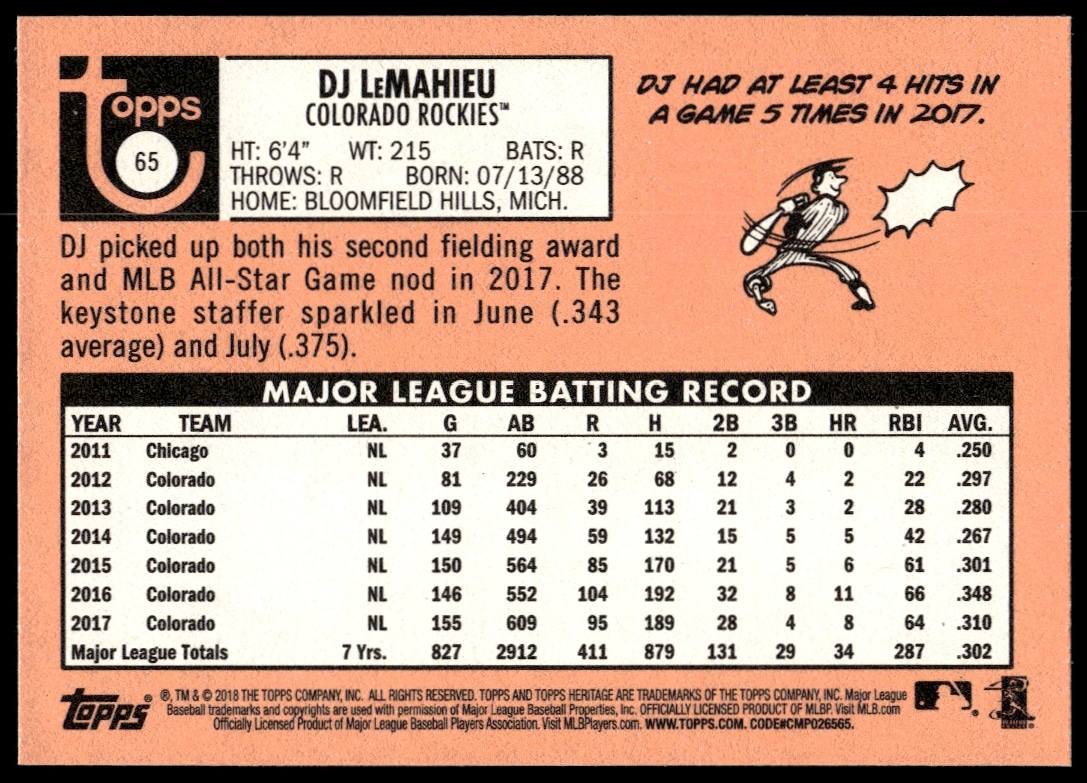 This Baseball card, from 2018 is part of the Topps Heritage card set. DJ LeMahieu is featured and has a card number of 65.