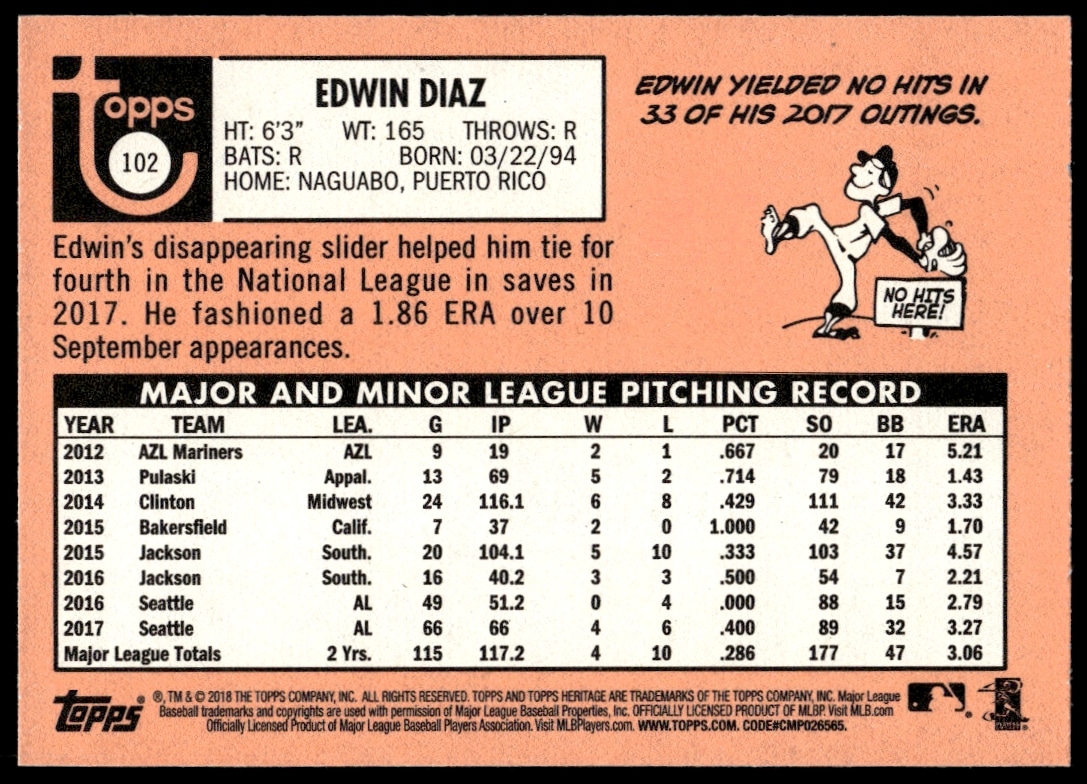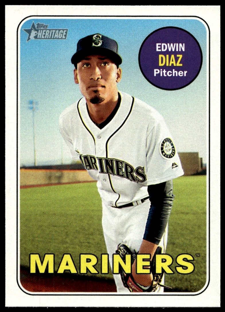 This Baseball card, from 2018 is part of the Topps Heritage card set. Edwin Diaz is featured and has a card number of 102.