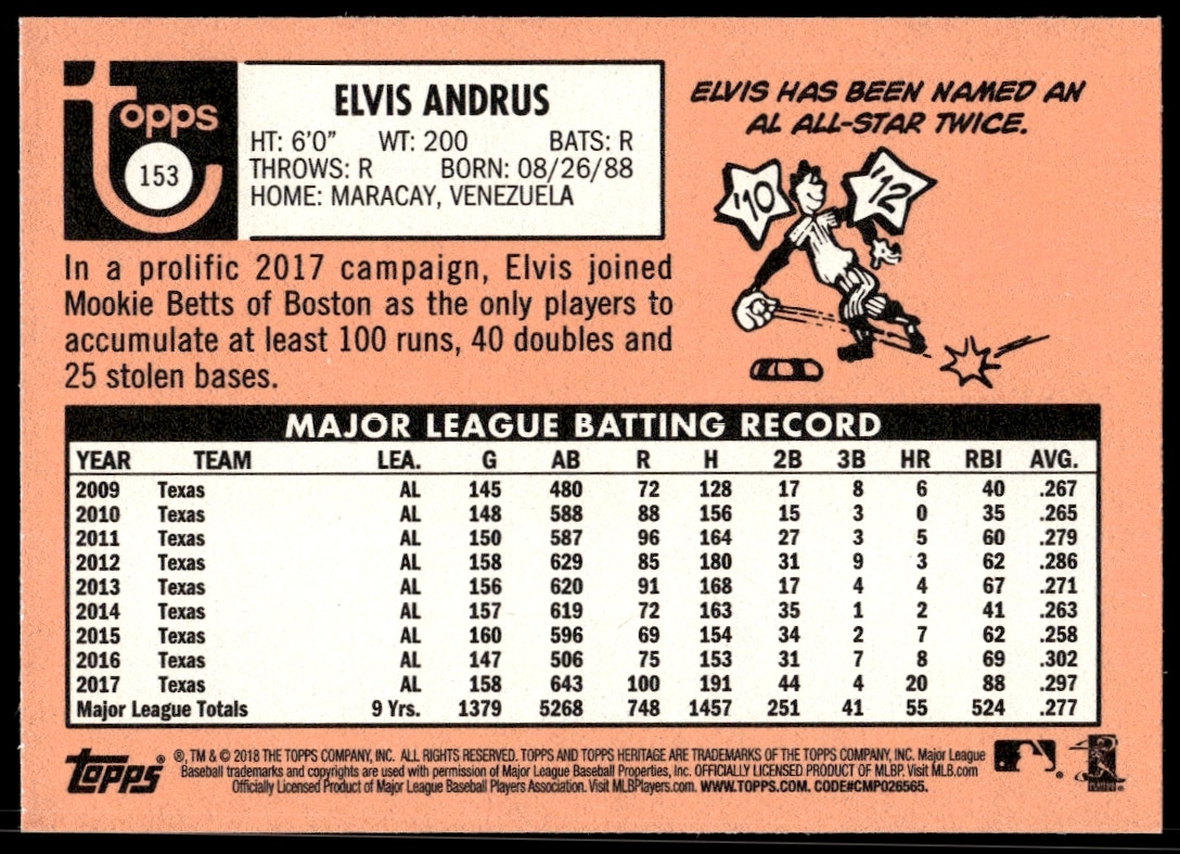 This Baseball card, from 2018 is part of the Topps Heritage card set. Elvis Andrus is featured and has a card number of 153.