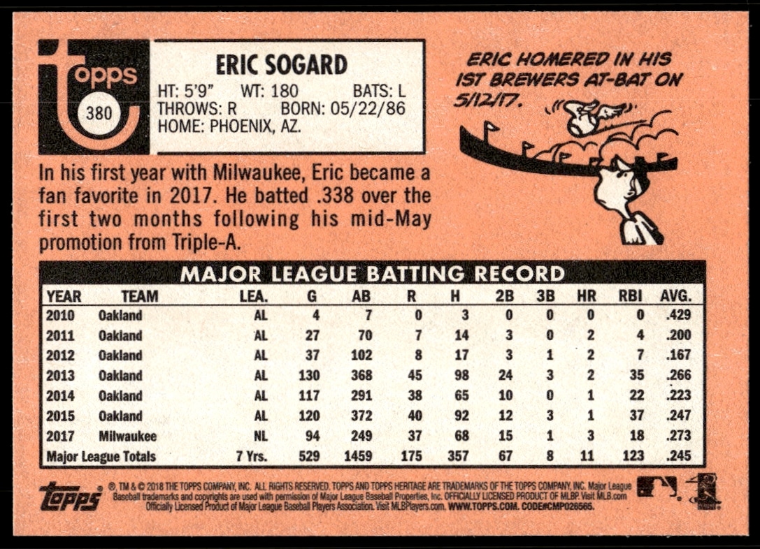 This Baseball card, from 2018 is part of the Topps Heritage card set. Eric Sogard is featured and has a card number of 380.