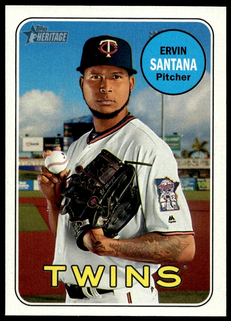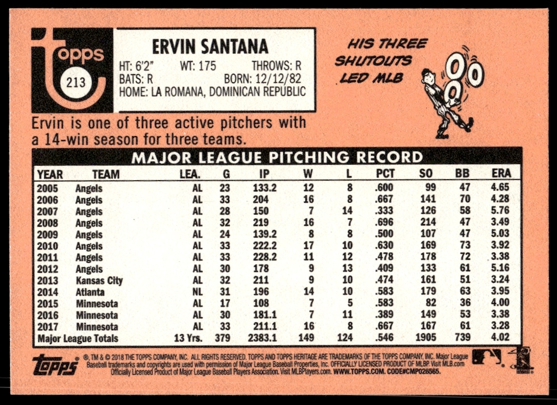 This Baseball card, from 2018 is part of the Topps Heritage card set. Ervin Santana is featured and has a card number of 213.