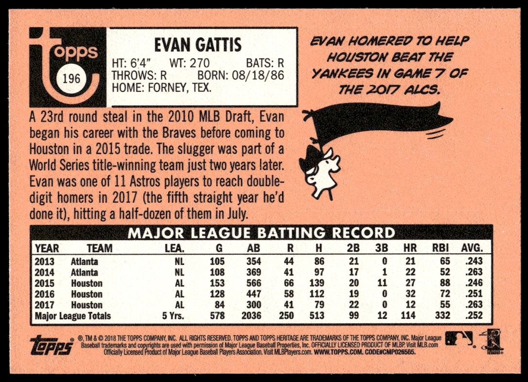This Baseball card, from 2018 is part of the Topps Heritage card set. Evan Gattis is featured and has a card number of 196.