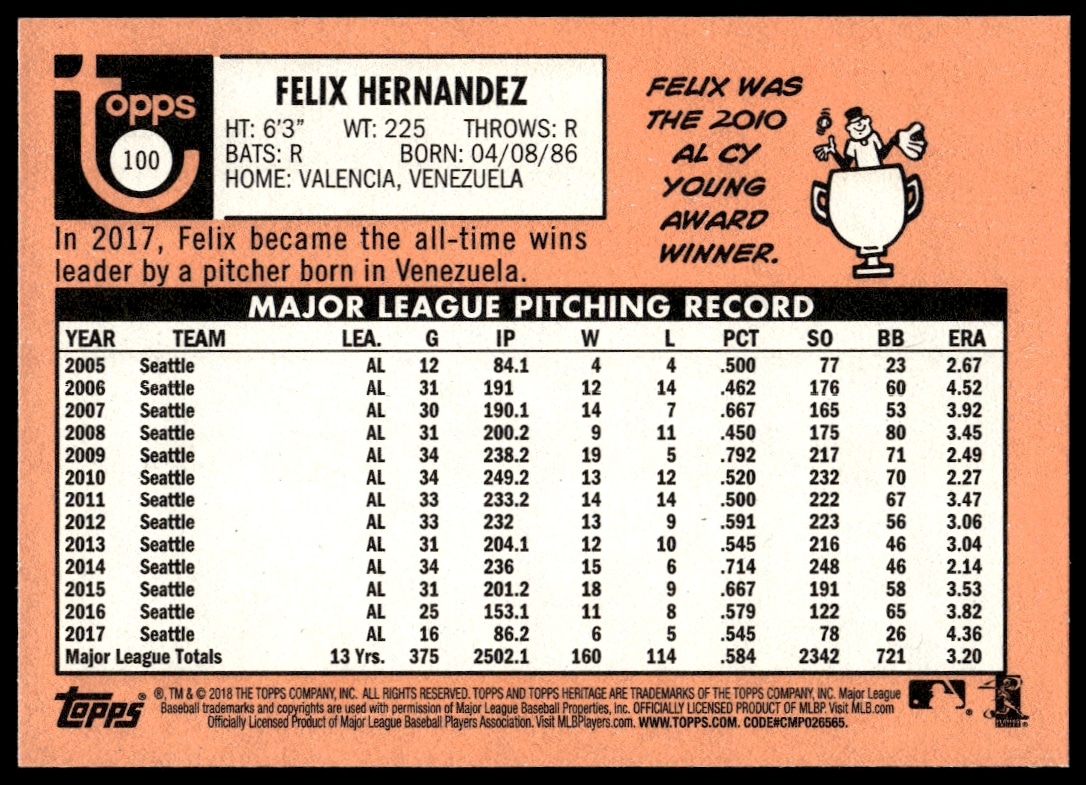 This Baseball card, from 2018 is part of the Topps Heritage card set. Felix Hernandez is featured and has a card number of 100.