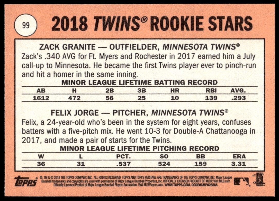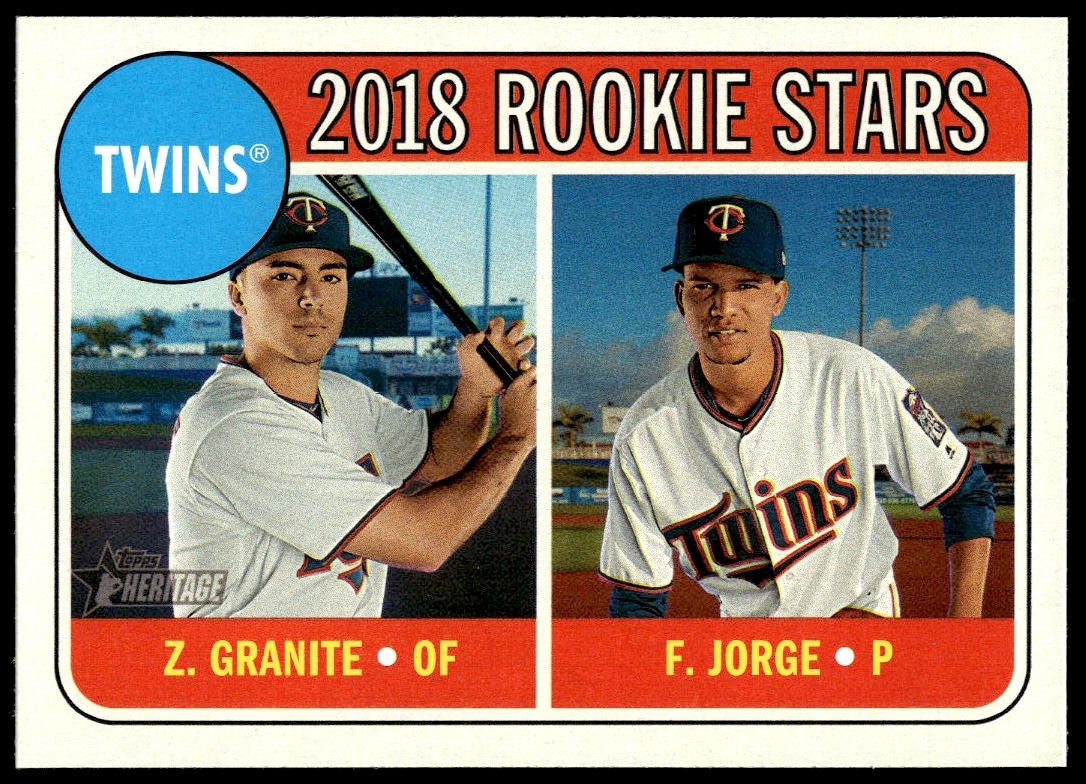 This Baseball card, from 2018 is part of the Topps Heritage card set. Felix Jorge / Zack Granite RC is featured and has a card number of 99.