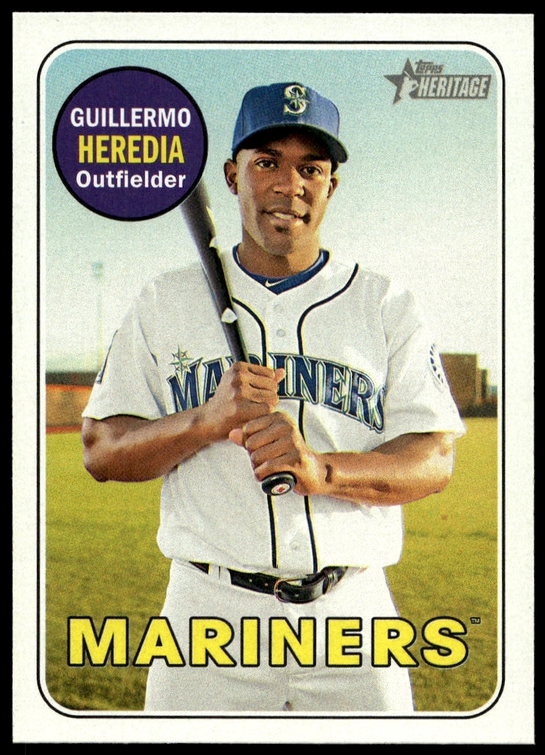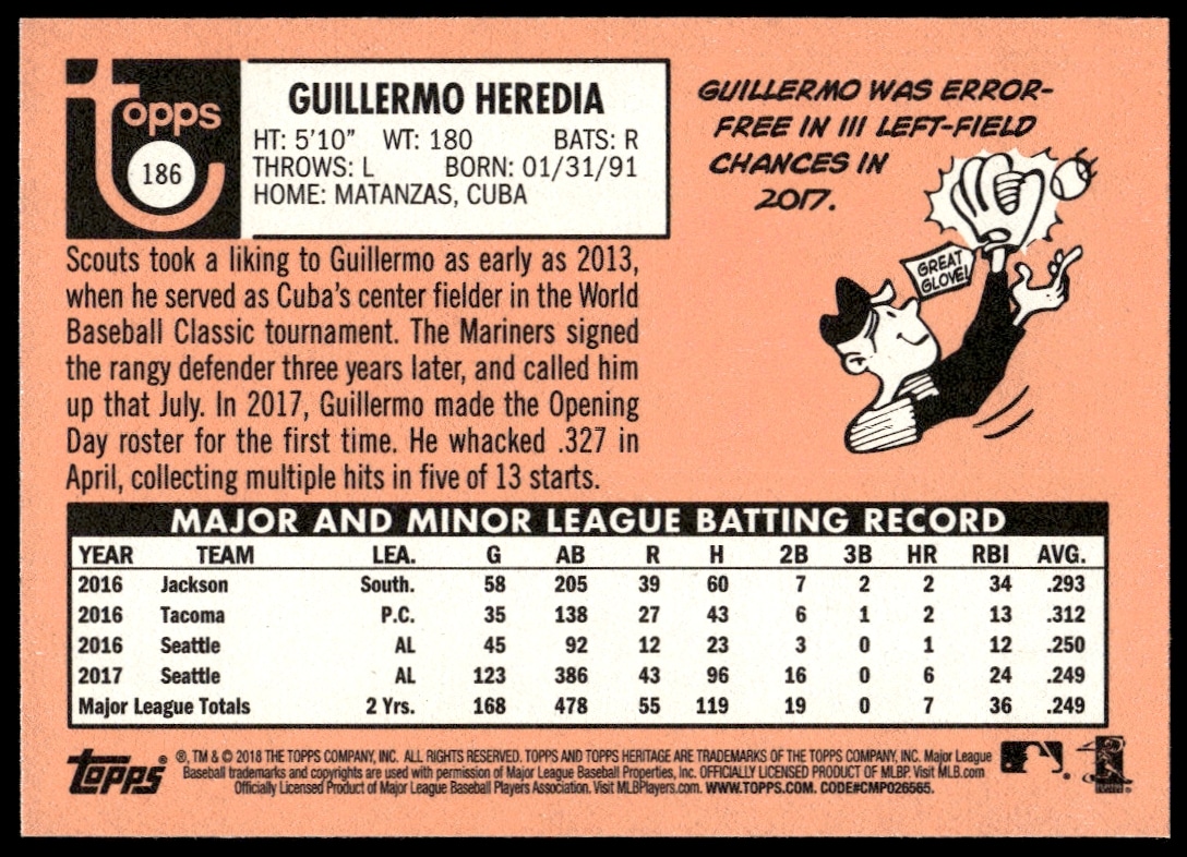 This Baseball card, from 2018 is part of the Topps Heritage card set. Guillermo Heredia is featured and has a card number of 186.
