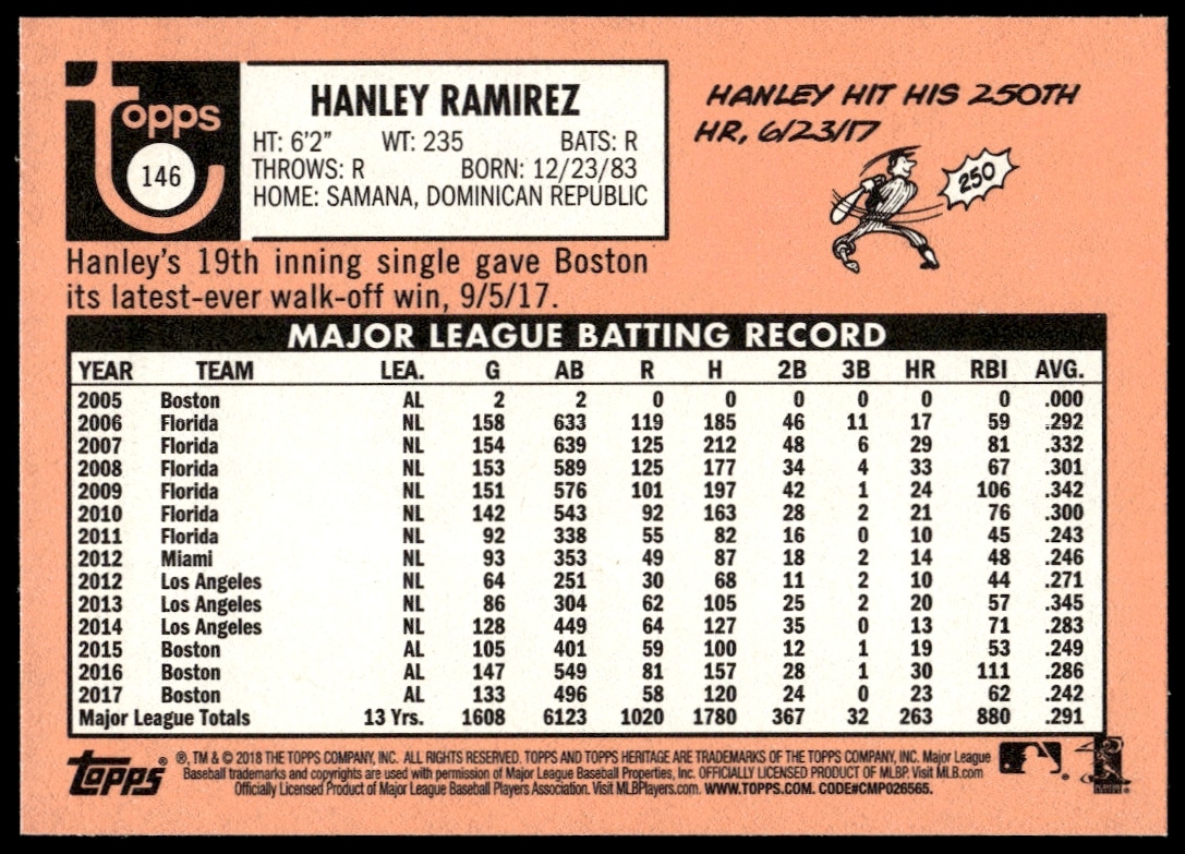This Baseball card, from 2018 is part of the Topps Heritage card set. Hanley Ramirez is featured and has a card number of 146.