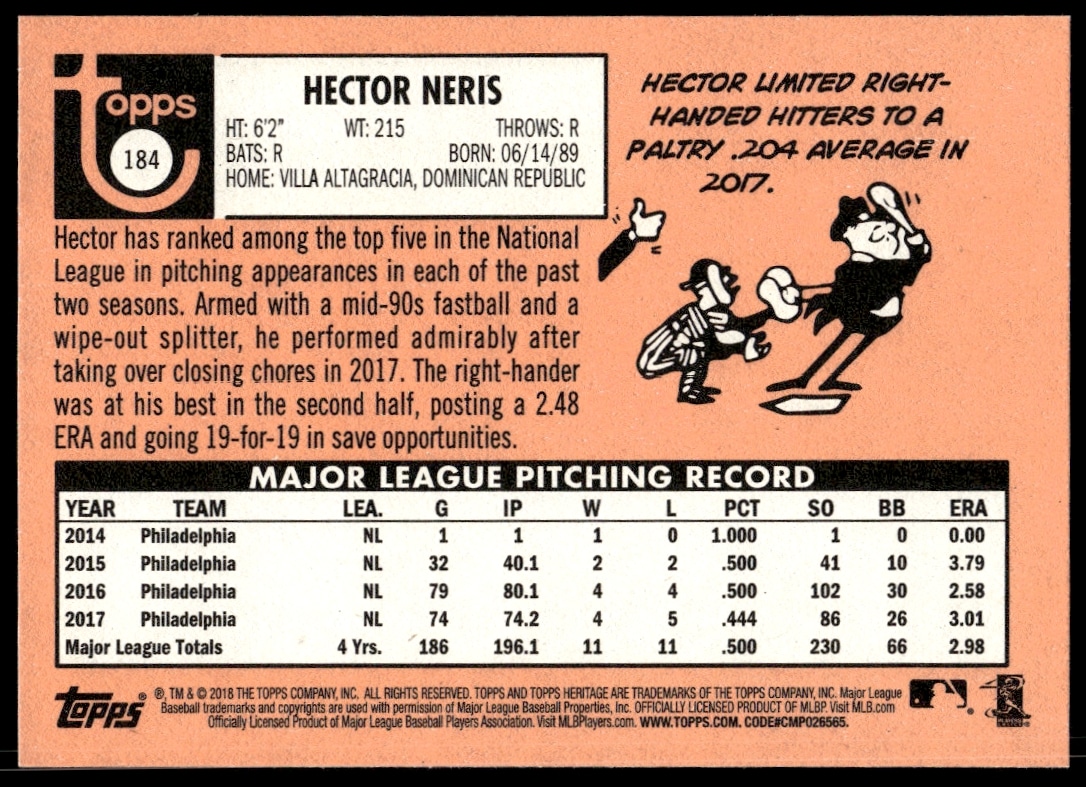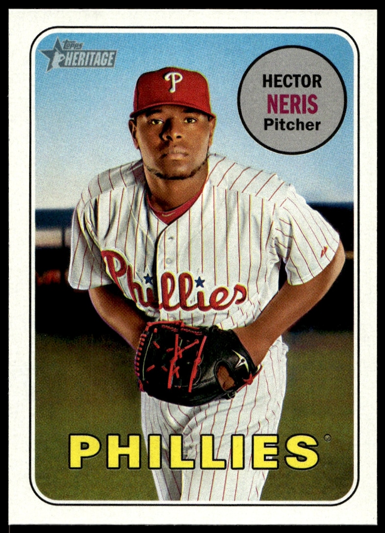 This Baseball card, from 2018 is part of the Topps Heritage card set. Hector Neris is featured and has a card number of 184.