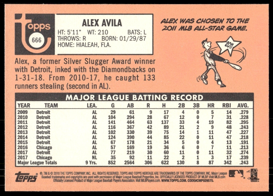 This BaseballΒ card, from 2018 is part of the Topps Heritage High NumberΒ card set. Alex Avila is featured and has a card number of 666.