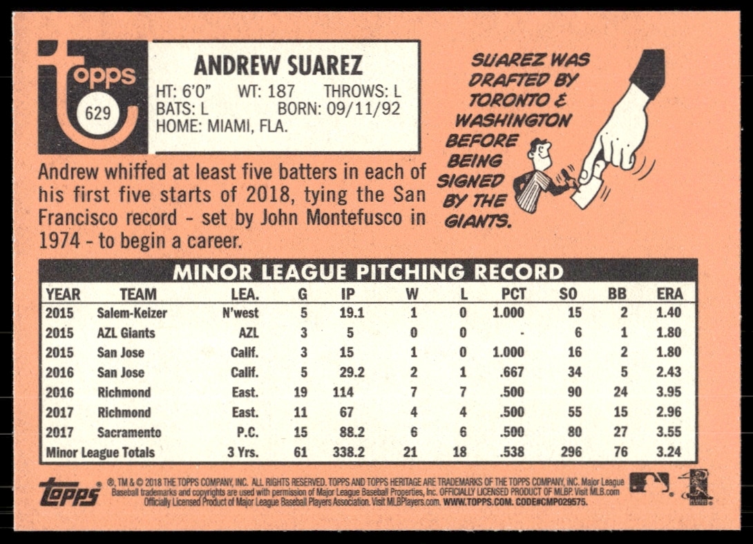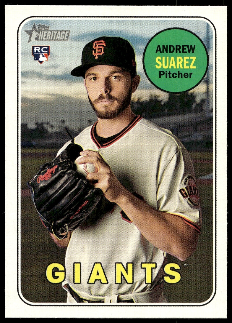 This BaseballΒ card, from 2018 is part of the Topps Heritage High NumberΒ card set. Andrew Suarez is featured and has a card number of 629.