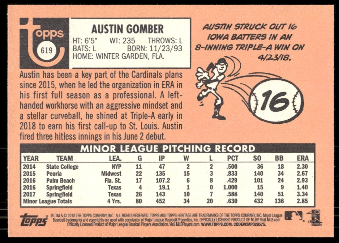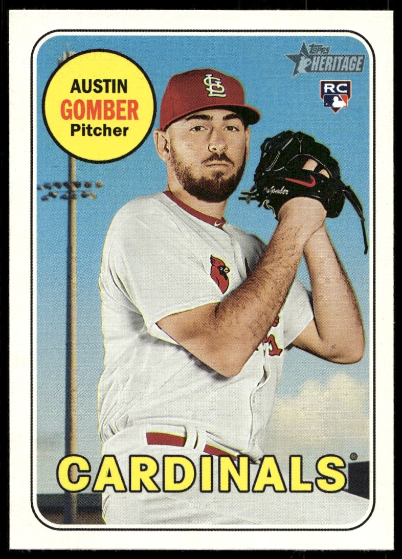 This BaseballΒ card, from 2018 is part of the Topps Heritage High NumberΒ card set. Austin Gomber is featured and has a card number of 619.