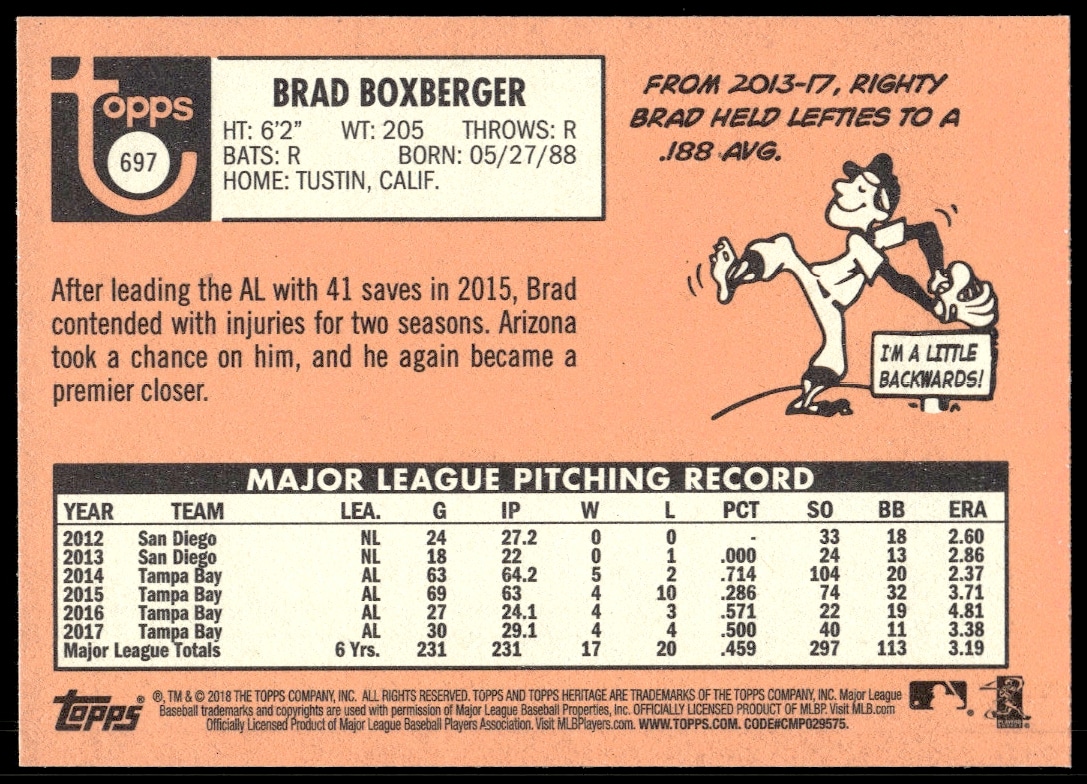 This BaseballΒ card, from 2018 is part of the Topps Heritage High NumberΒ card set. Brad Boxberger is featured and has a card number of 697.