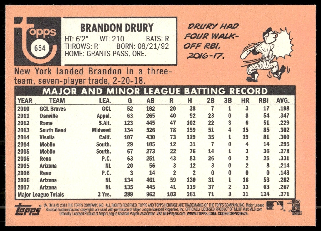 This BaseballΒ card, from 2018 is part of the Topps Heritage High NumberΒ card set. Brandon Drury is featured and has a card number of 654.