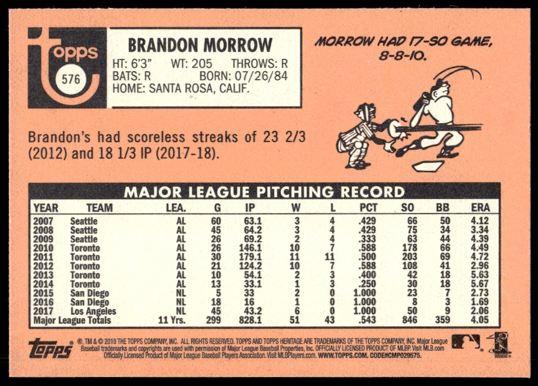 This BaseballΒ card, from 2018 is part of the Topps Heritage High NumberΒ card set. Brandon Morrow is featured and has a card number of 576.