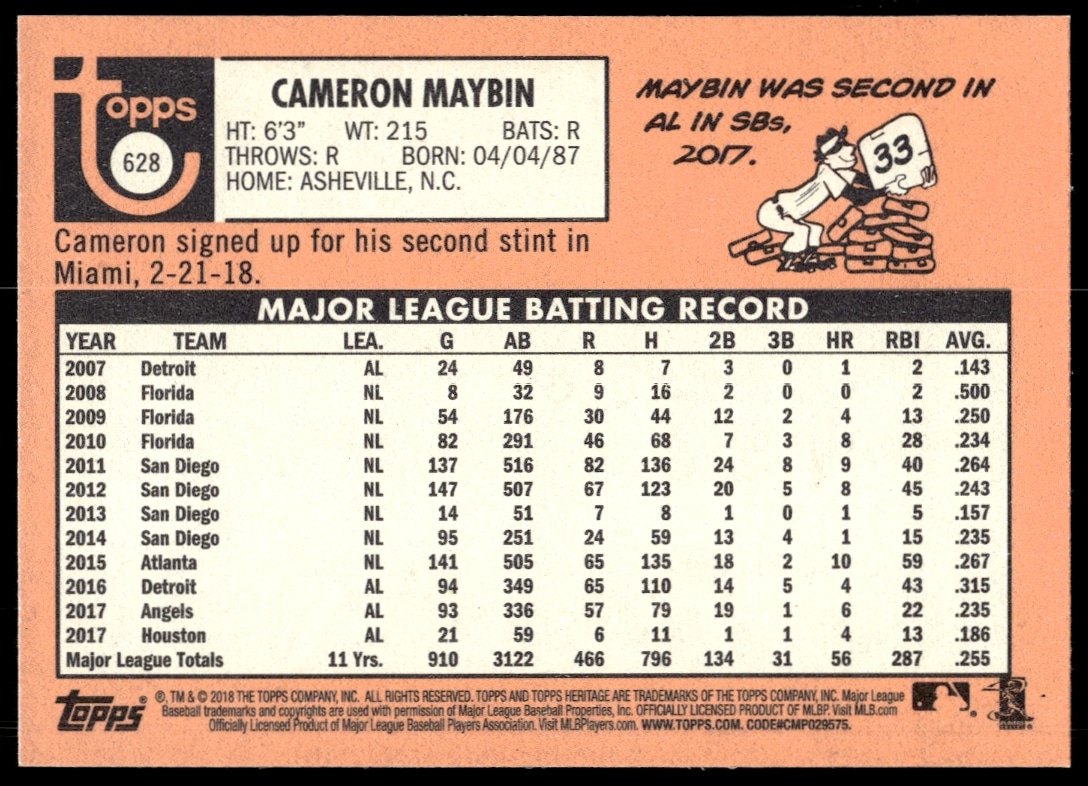 This BaseballΒ card, from 2018 is part of the Topps Heritage High NumberΒ card set. Cameron Maybin is featured and has a card number of 628.
