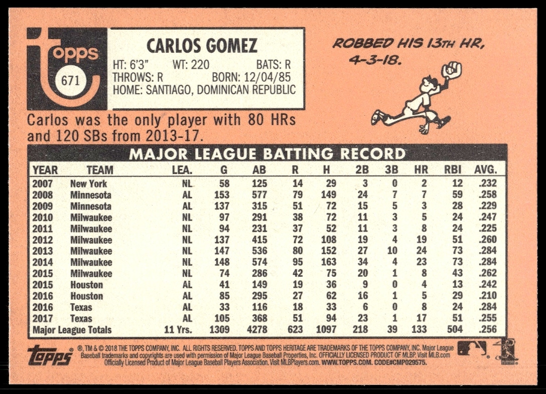 This BaseballΒ card, from 2018 is part of the Topps Heritage High NumberΒ card set. Carlos Gomez is featured and has a card number of 671.