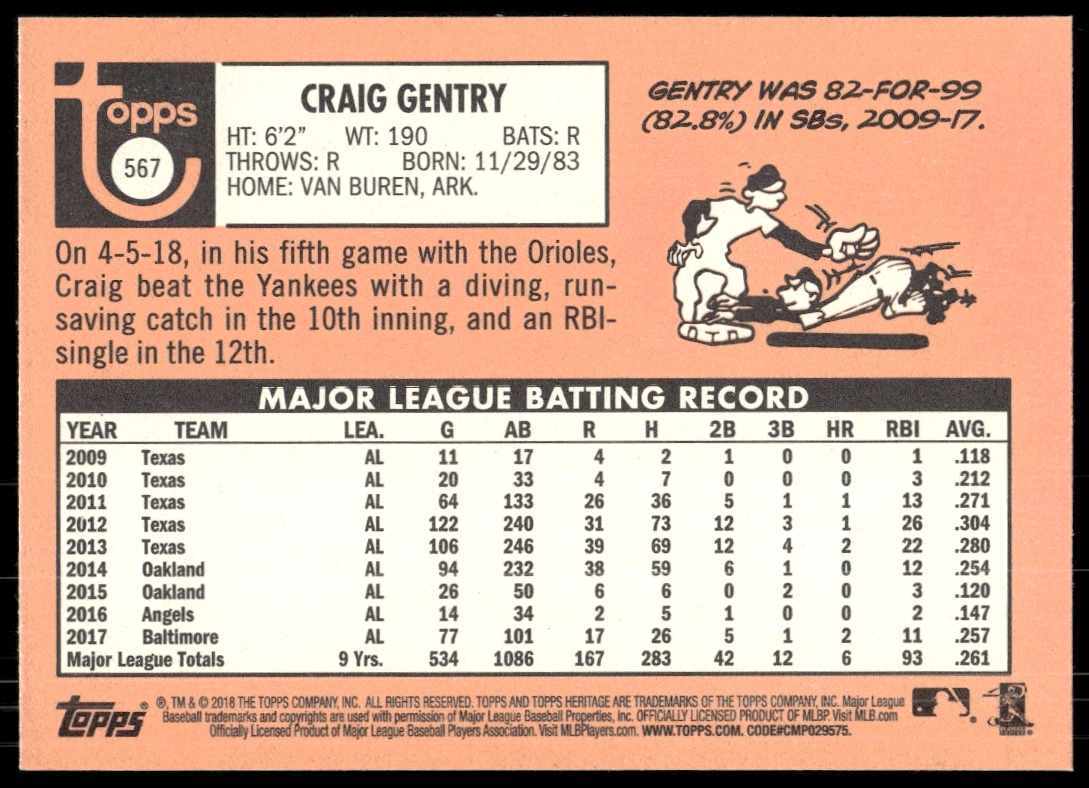 This BaseballΒ card, from 2018 is part of the Topps Heritage High NumberΒ card set. Craig Gentry is featured and has a card number of 567.