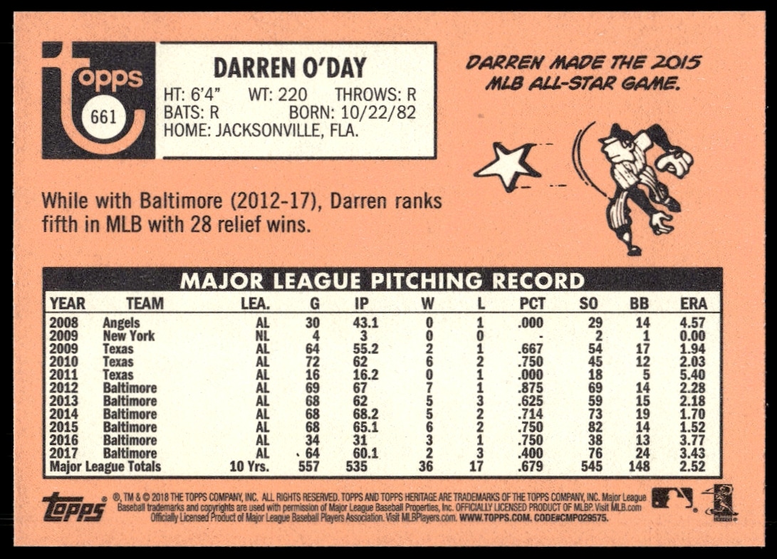 This BaseballΒ card, from 2018 is part of the Topps Heritage High NumberΒ card set. Darren O’Day is featured and has a card number of 661.