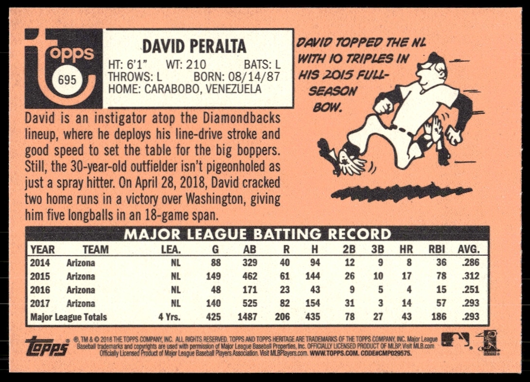This BaseballΒ card, from 2018 is part of the Topps Heritage High NumberΒ card set. David Peralta is featured and has a card number of 695.