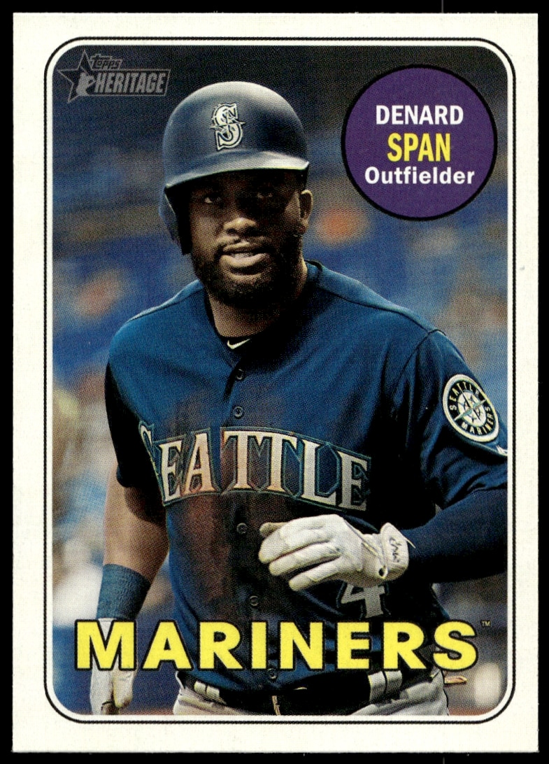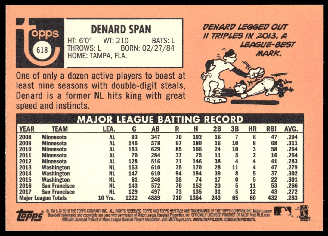 This BaseballΒ card, from 2018 is part of the Topps Heritage High NumberΒ card set. Denard Span is featured and has a card number of 618.