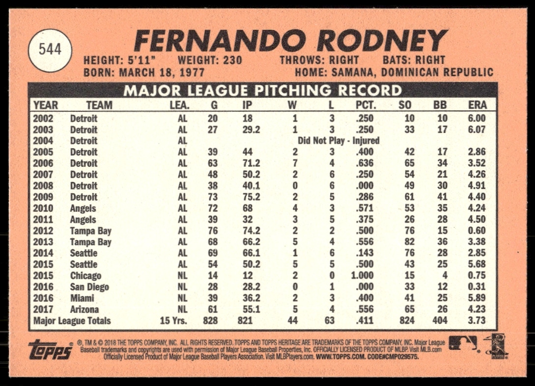This BaseballΒ card, from 2018 is part of the Topps Heritage High NumberΒ card set. Fernando Rodney is featured and has a card number of 544.