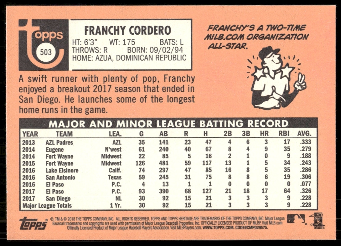 This BaseballΒ card, from 2018 is part of the Topps Heritage High NumberΒ card set. Franchy Cordero is featured and has a card number of 503.