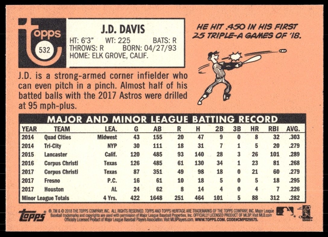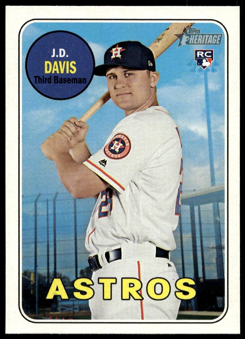 This BaseballΒ card, from 2018 is part of the Topps Heritage High NumberΒ card set. J.D. Davis is featured and has a card number of 532.