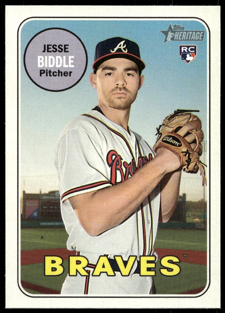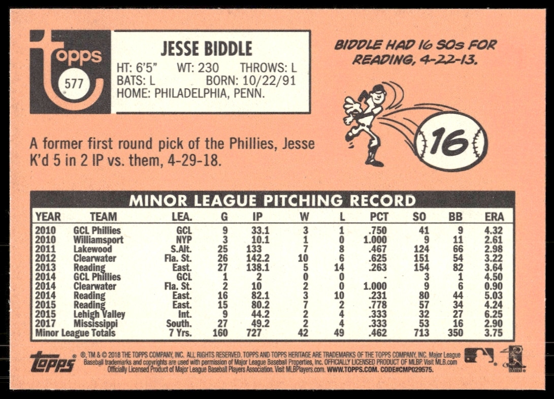 This BaseballΒ card, from 2018 is part of the Topps Heritage High NumberΒ card set. Jesse Biddle is featured and has a card number of 577.