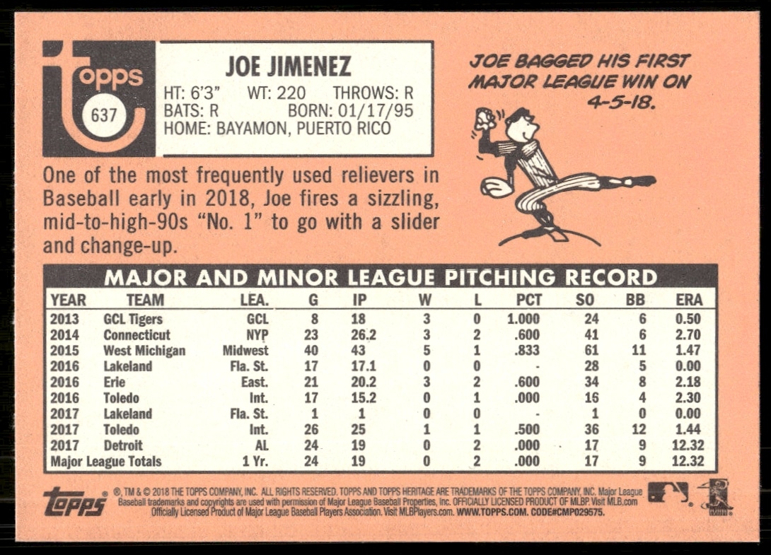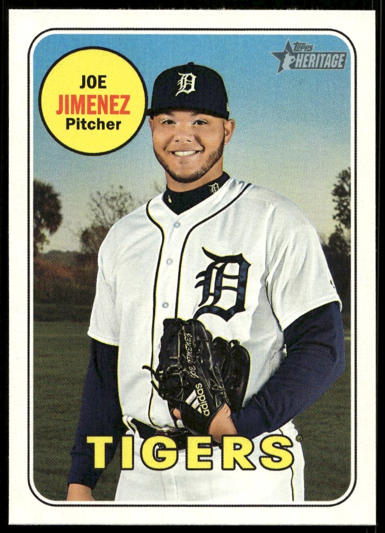 This BaseballΒ card, from 2018 is part of the Topps Heritage High NumberΒ card set. Joe Jimenez is featured and has a card number of 637.