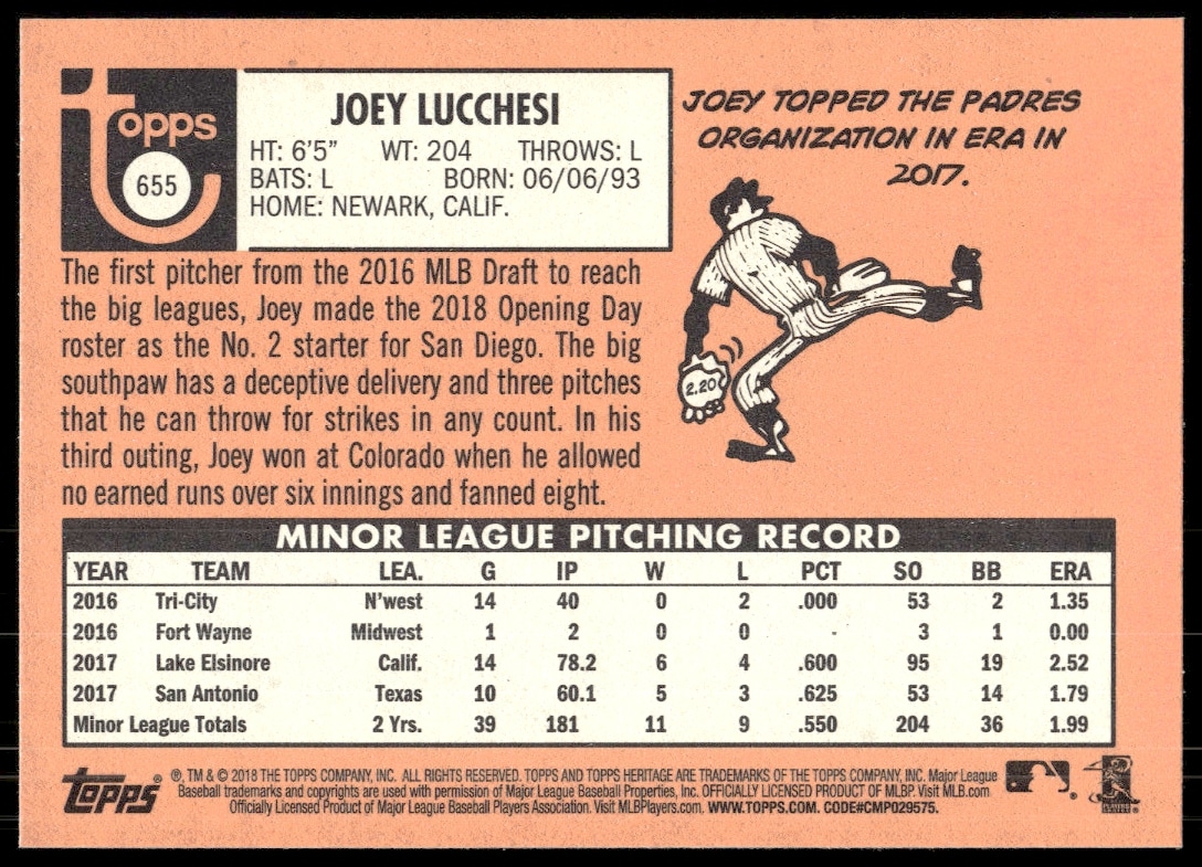 This BaseballΒ card, from 2018 is part of the Topps Heritage High NumberΒ card set. Joey Lucchesi is featured and has a card number of 655.