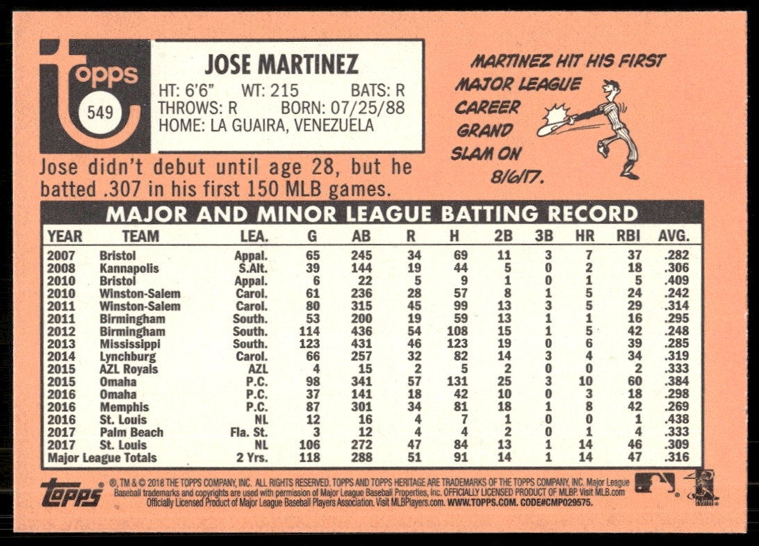 This BaseballΒ card, from 2018 is part of the Topps Heritage High NumberΒ card set. Jose Martinez is featured and has a card number of 549.