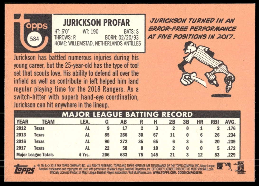 This BaseballΒ card, from 2018 is part of the Topps Heritage High NumberΒ card set. Jurickson Profar is featured and has a card number of 584.