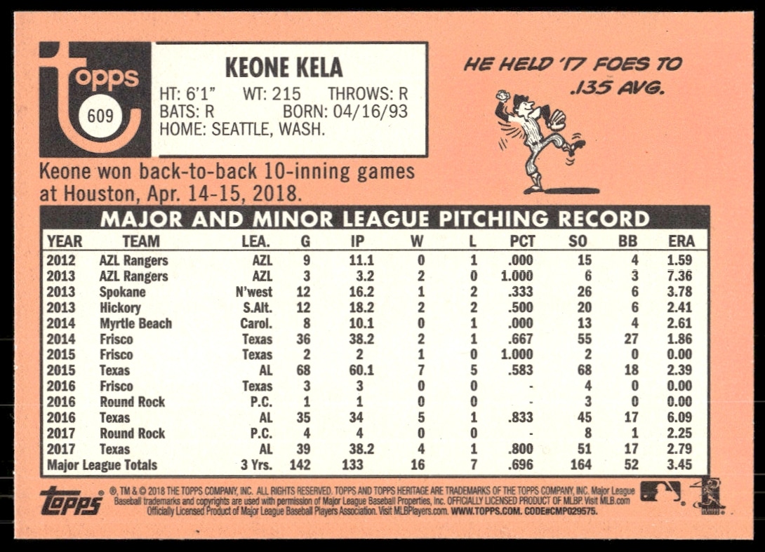 This BaseballΒ card, from 2018 is part of the Topps Heritage High NumberΒ card set. Keone Kela is featured and has a card number of 609.