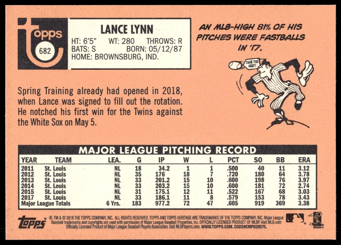 This BaseballΒ card, from 2018 is part of the Topps Heritage High NumberΒ card set. Lance Lynn is featured and has a card number of 682.