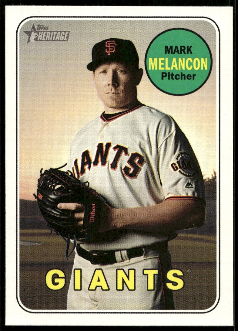 This Baseball card, from 2018 is part of the Topps Heritage High Number card set. Mark Melancon is featured and has a card number of 553.