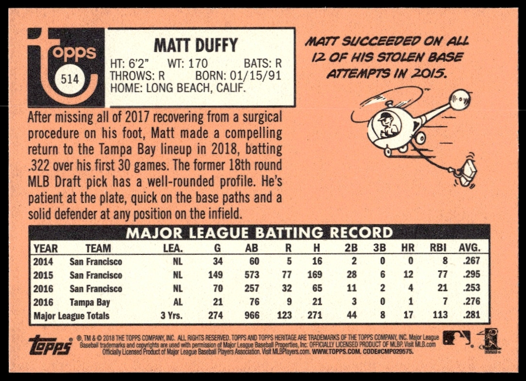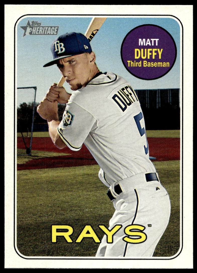 This Baseball card, from 2018 is part of the Topps Heritage High Number card set. Matt Duffy is featured and has a card number of 514.