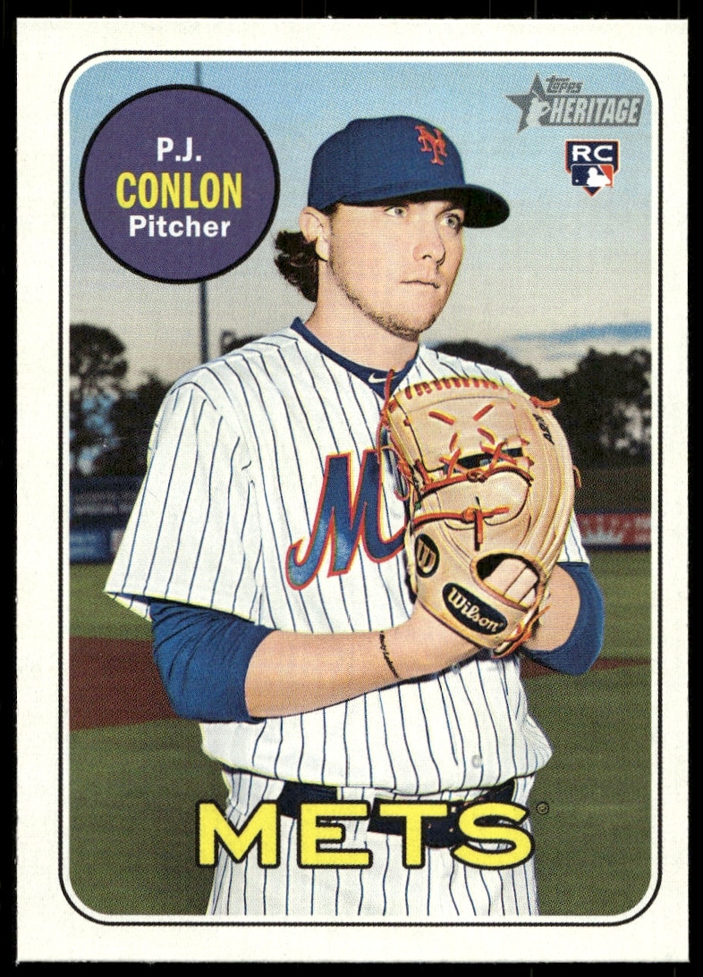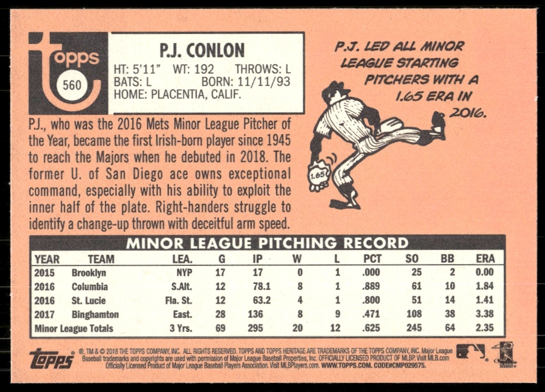 This BaseballΒ card, from 2018 is part of the Topps Heritage High NumberΒ card set. P.J. Conlon is featured and has a card number of 560.
