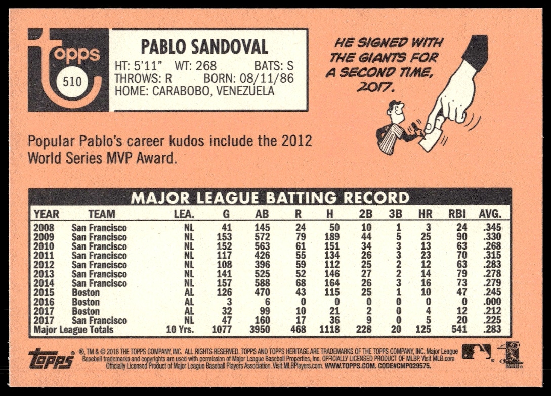 This BaseballΒ card, from 2018 is part of the Topps Heritage High NumberΒ card set. Pablo Sandoval is featured and has a card number of 510.