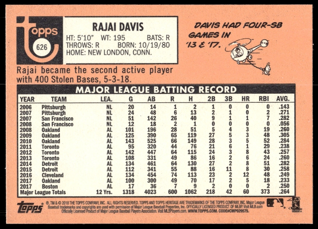 This BaseballΒ card, from 2018 is part of the Topps Heritage High NumberΒ card set. Rajai Davis is featured and has a card number of 626.