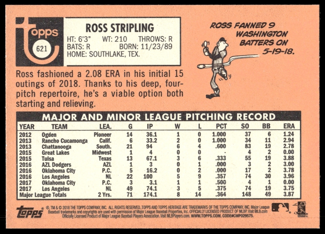 This BaseballΒ card, from 2018 is part of the Topps Heritage High NumberΒ card set. Ross Stripling is featured and has a card number of 621.