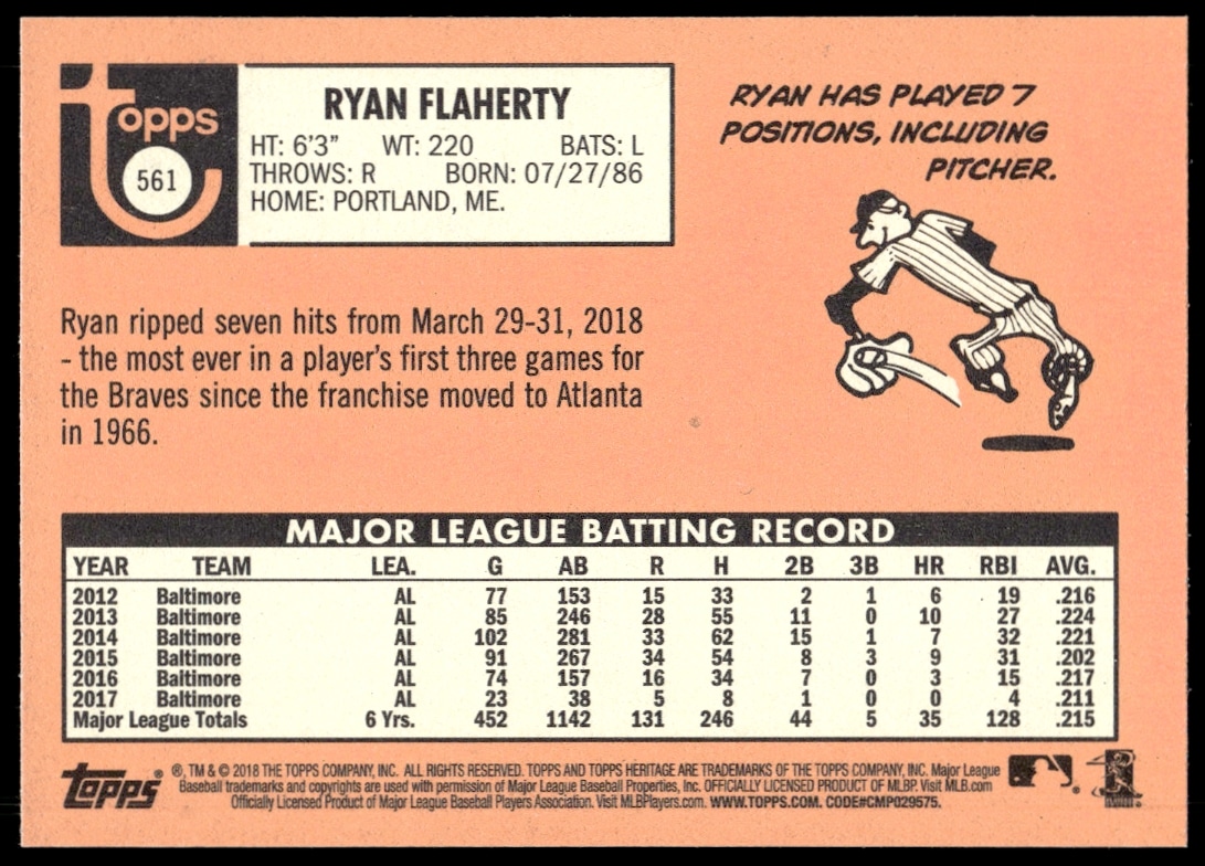 This BaseballΒ card, from 2018 is part of the Topps Heritage High NumberΒ card set. Ryan Flaherty is featured and has a card number of 561.