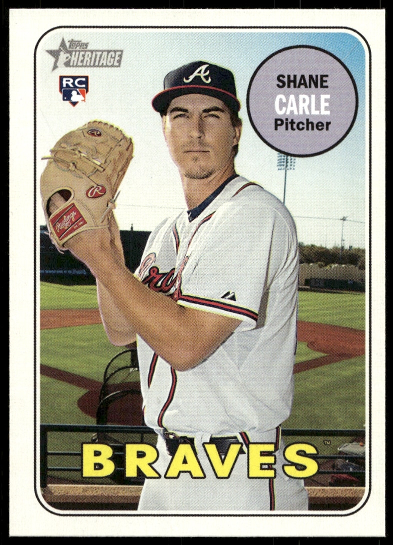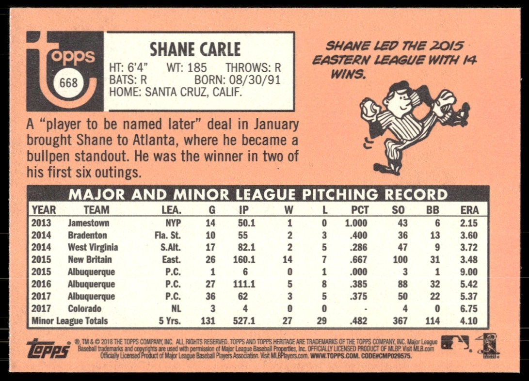 This BaseballΒ card, from 2018 is part of the Topps Heritage High NumberΒ card set. Shane Carle is featured and has a card number of 668.