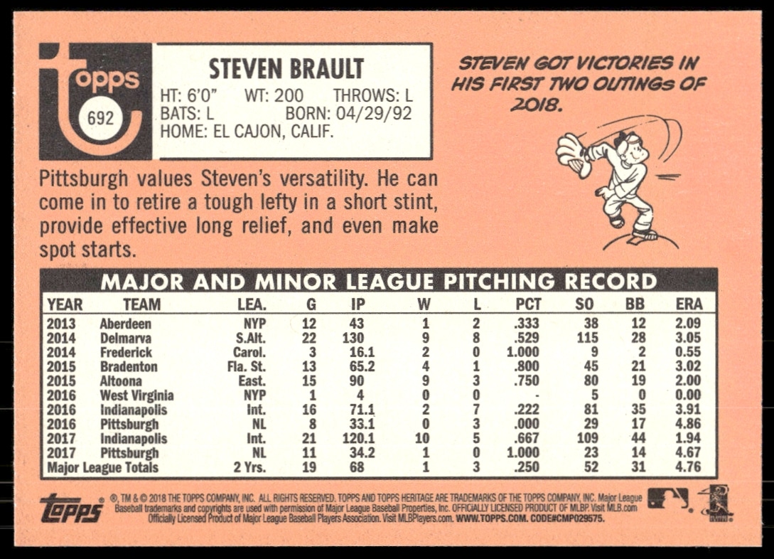 This BaseballΒ card, from 2018 is part of the Topps Heritage High NumberΒ card set. Steven Brault is featured and has a card number of 692.