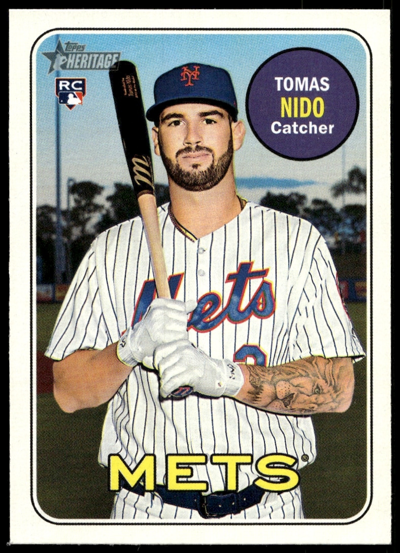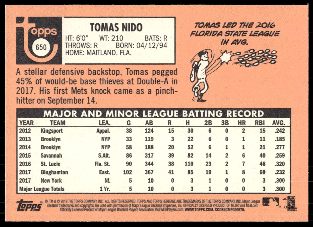 This BaseballΒ card, from 2018 is part of the Topps Heritage High NumberΒ card set. Tomas Nido is featured and has a card number of 650.